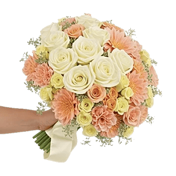 Large roses- just a fewMini rosesDahlias Hydrangeas Baby’s breathAll mixed throughoutWhite, pale yellow, pale orange and dusty pink
