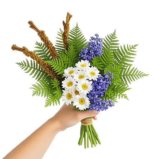 Moss-covered twigs, green ferns, white anemones, and small clusters of bluebells