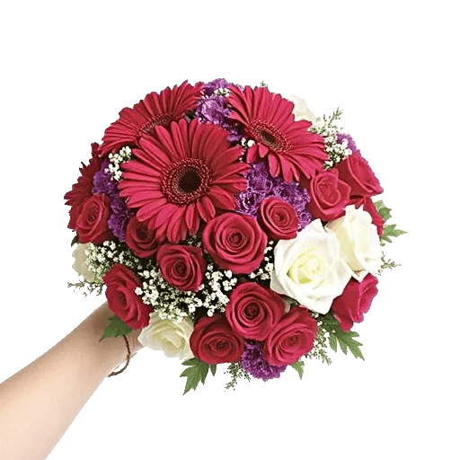 Red gerbera daisies, purple carnations, hot pink spray roses, white roses, red roses, lavender carnations, white baby's breath, greenery, galaxy themed